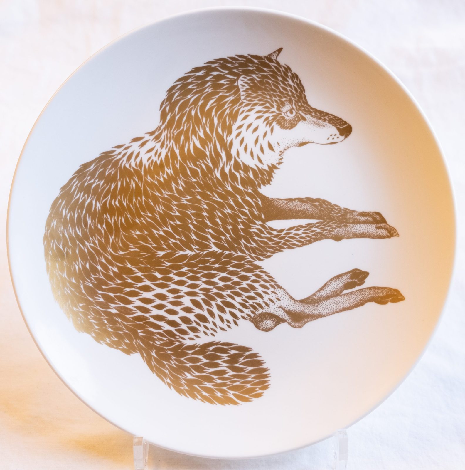 From reknown Swedish porcelain company Gustavsberg, comes this beautiful plate Wolf / Varg. It is No 3 in series Endangered Species / Arter i fara, designed by Paul Hoff. The series was made during 1973-1994, this plate is from 1975. Made of bone china with décor in gold. Limited edition.