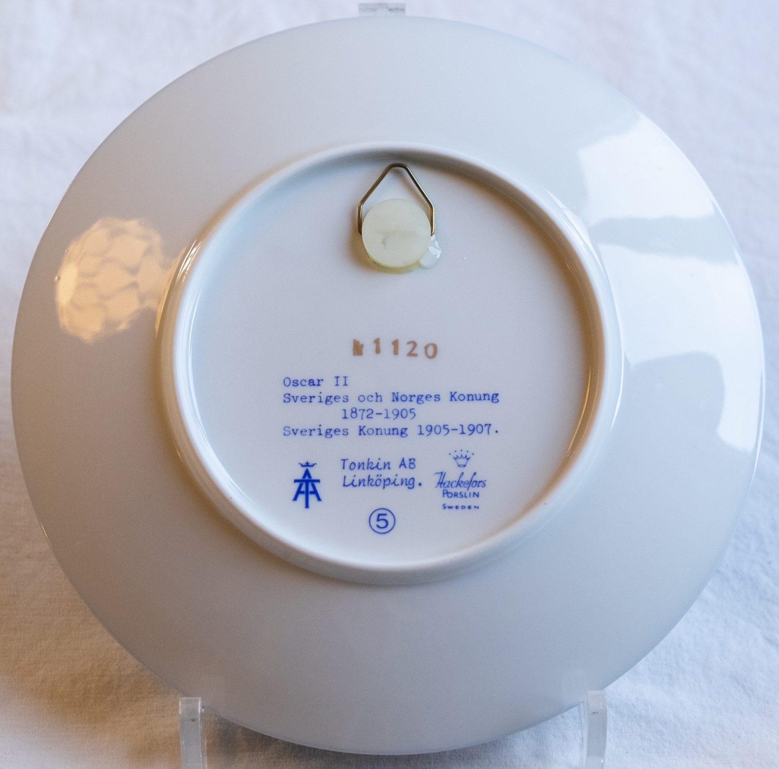 On the backside it says Oscar II King of Sweden and Norway 1872-1905, King of Sweden 1905-1907. There are also two different stamps, one from Hackefors porcelain manufacturer, Sweden, the other from Tonkin AB, Linköping, Sweden. As far as I know, Tonkin was a renowned seller of collectibles.