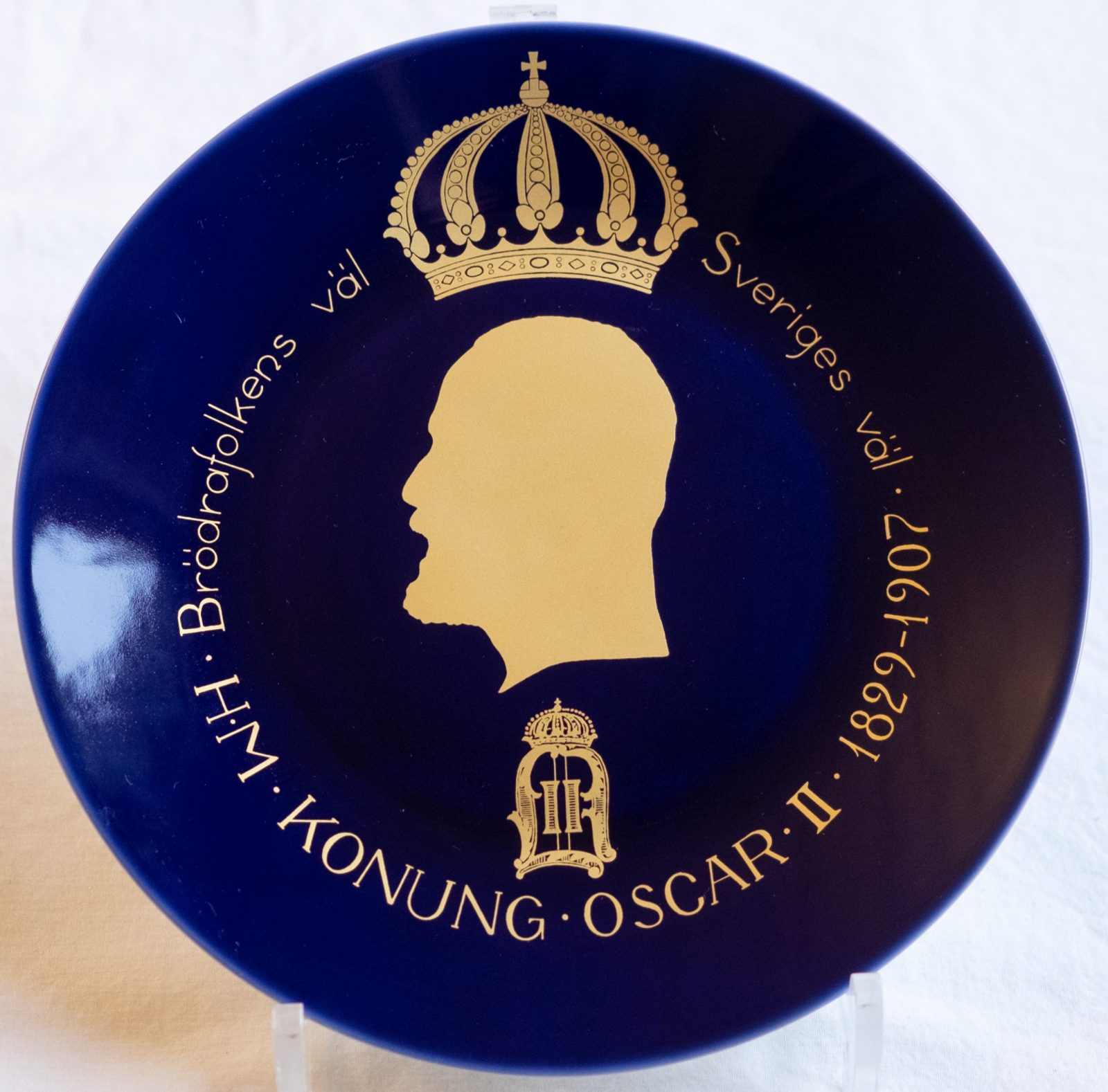 Swedish porcelain manufacturer Hackefors made a series of Remembrance Plates (Minnestallrik) depicting Swedish kings. This plate was made in remembrance of Swedish king Oscar II. Limited edition, this is No. 1120. The plate is made of pure cobalt and gold.