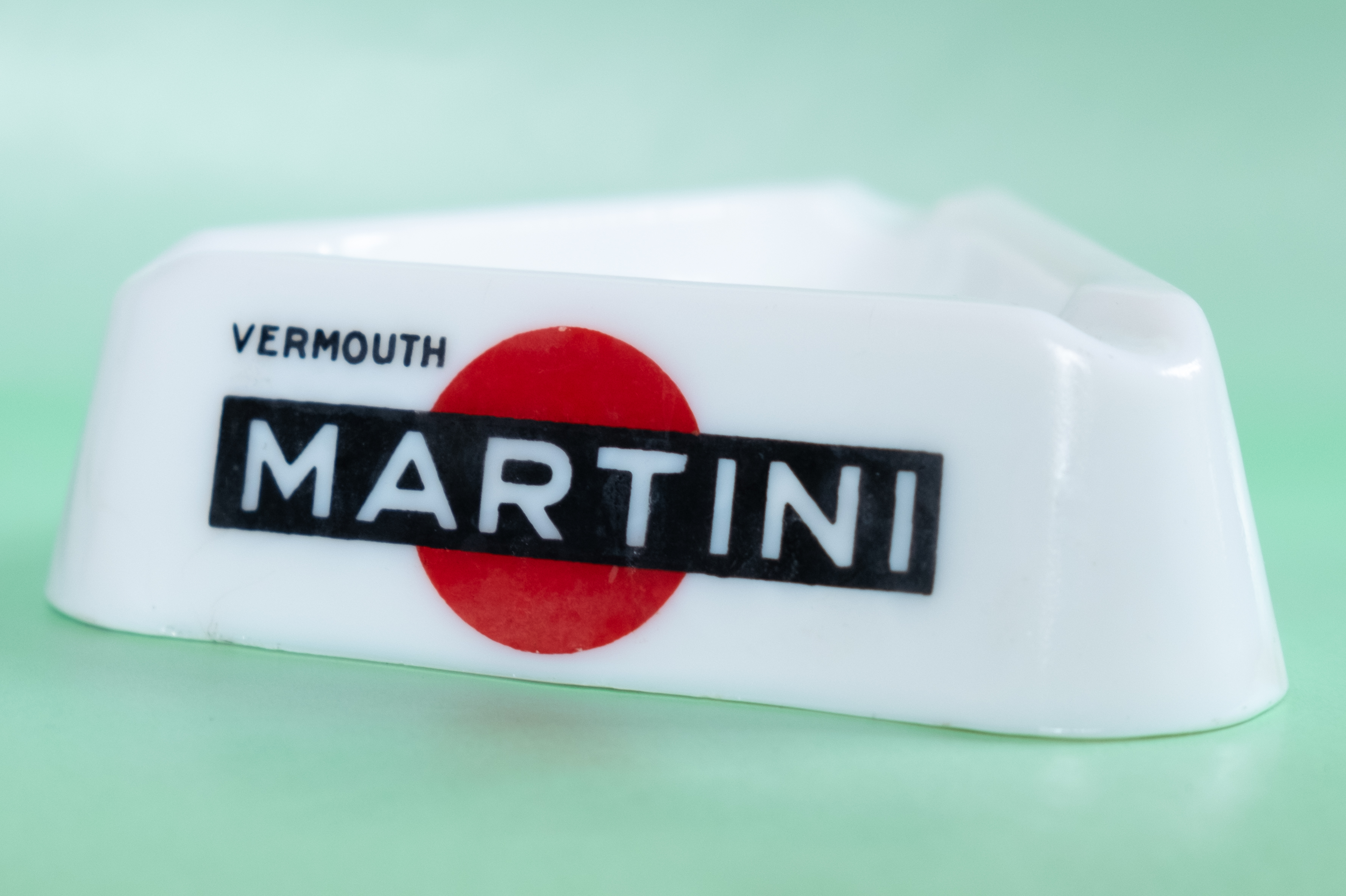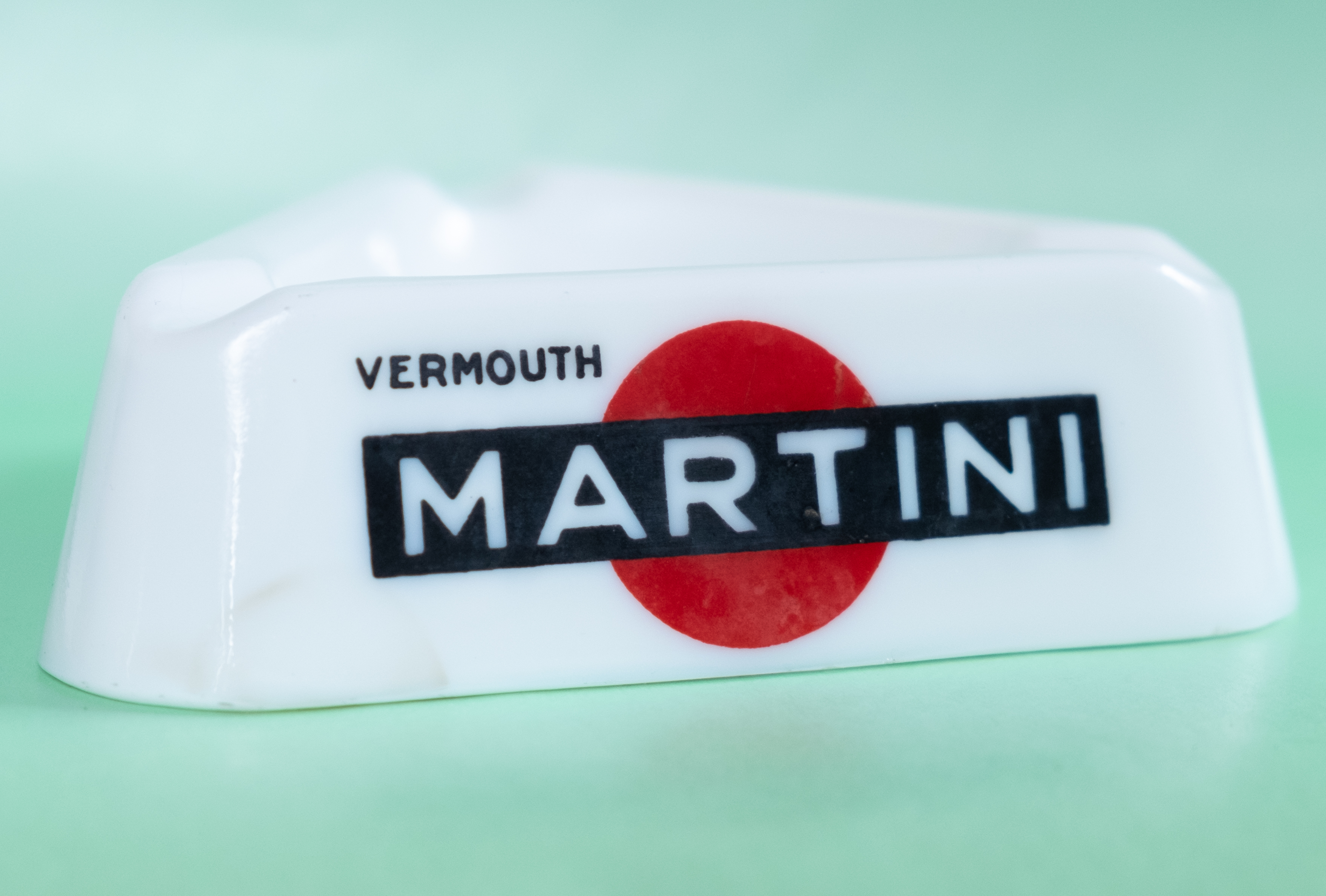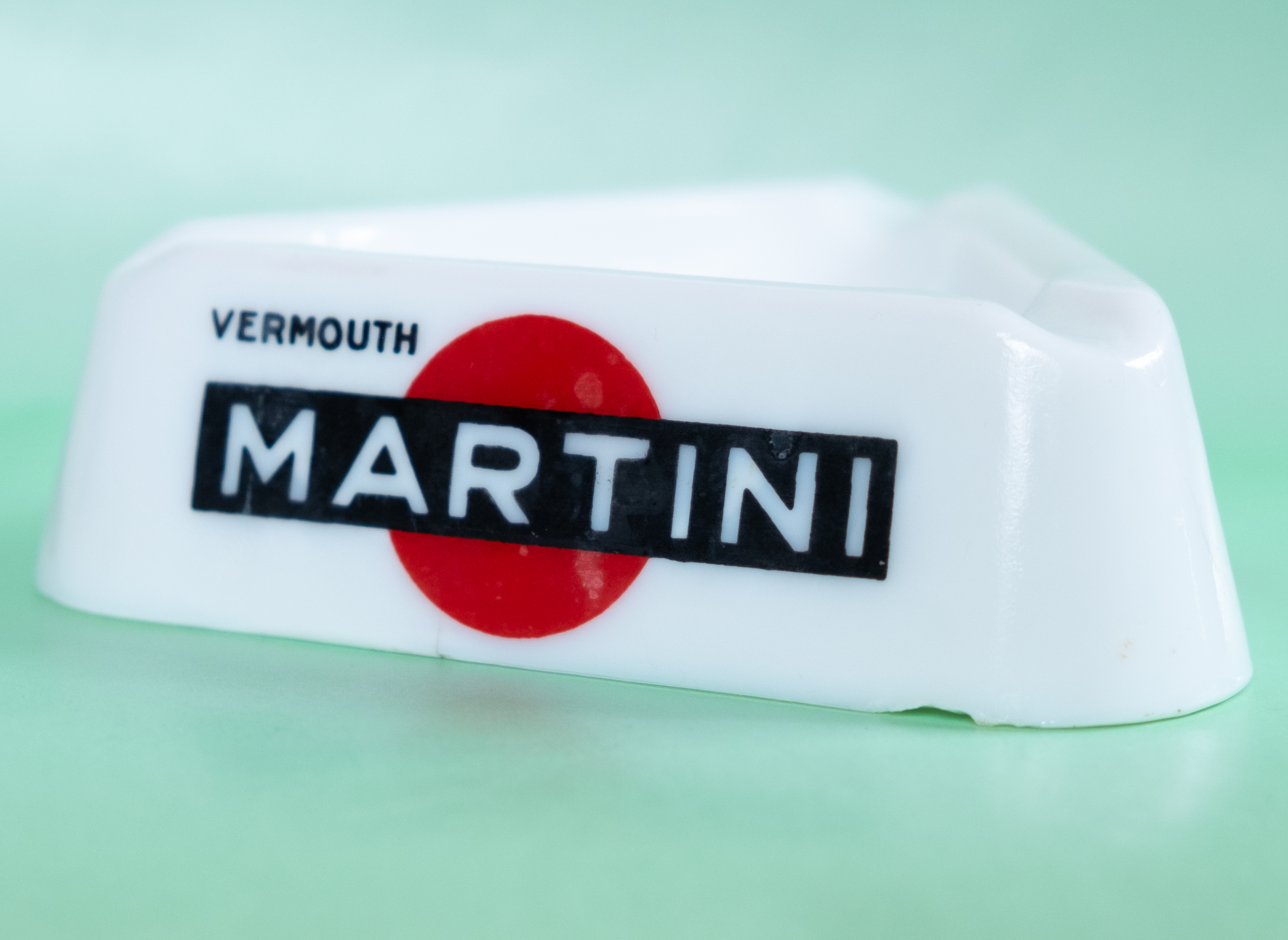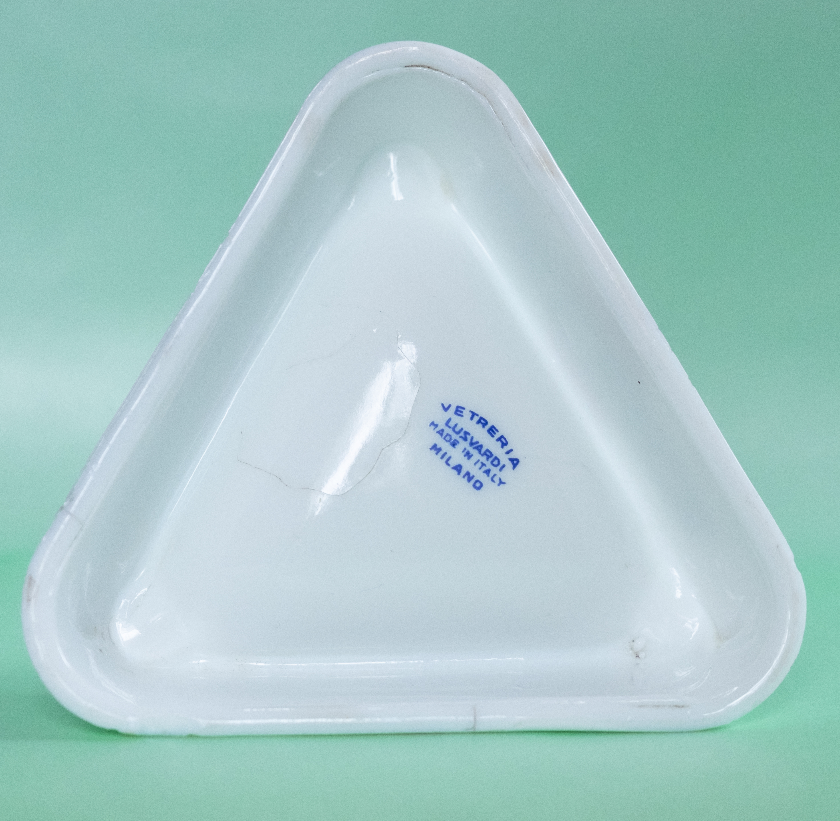 A classic, iconic, triangular ashtray, ”Vermouth Martini”, made in porcelain by Italian manufacturer Vetreria Lusvardi, Milano. Made in Italy. 1940s.