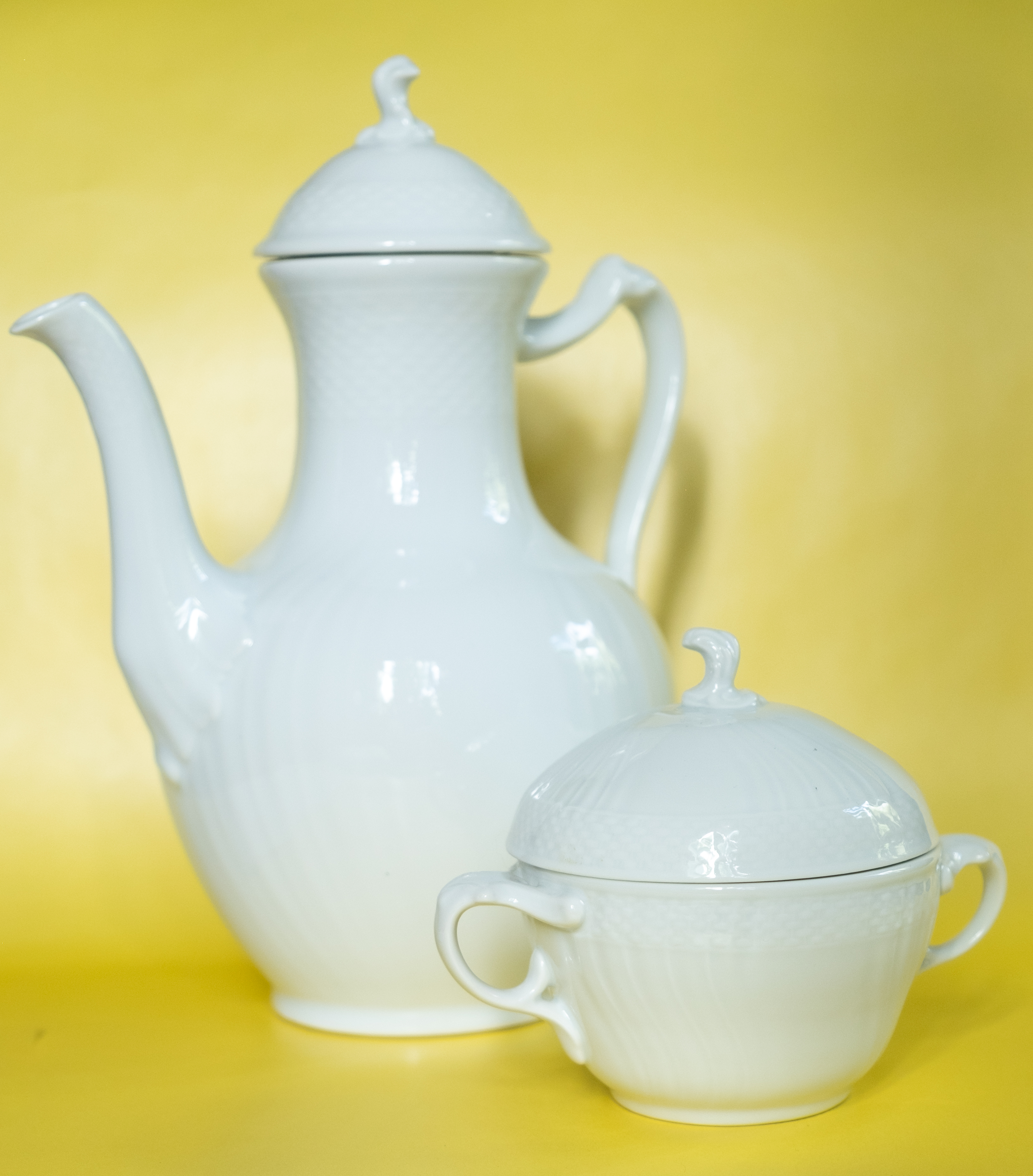 Royal Copenhagen / Kunglig Dansk (Bing & Grøndahl) coffee pot and sugar bowl from the white series Elegance (discontinued to my knowledge). Both the coffee pot and the sugar bowl have never been used and come in mint condition.
