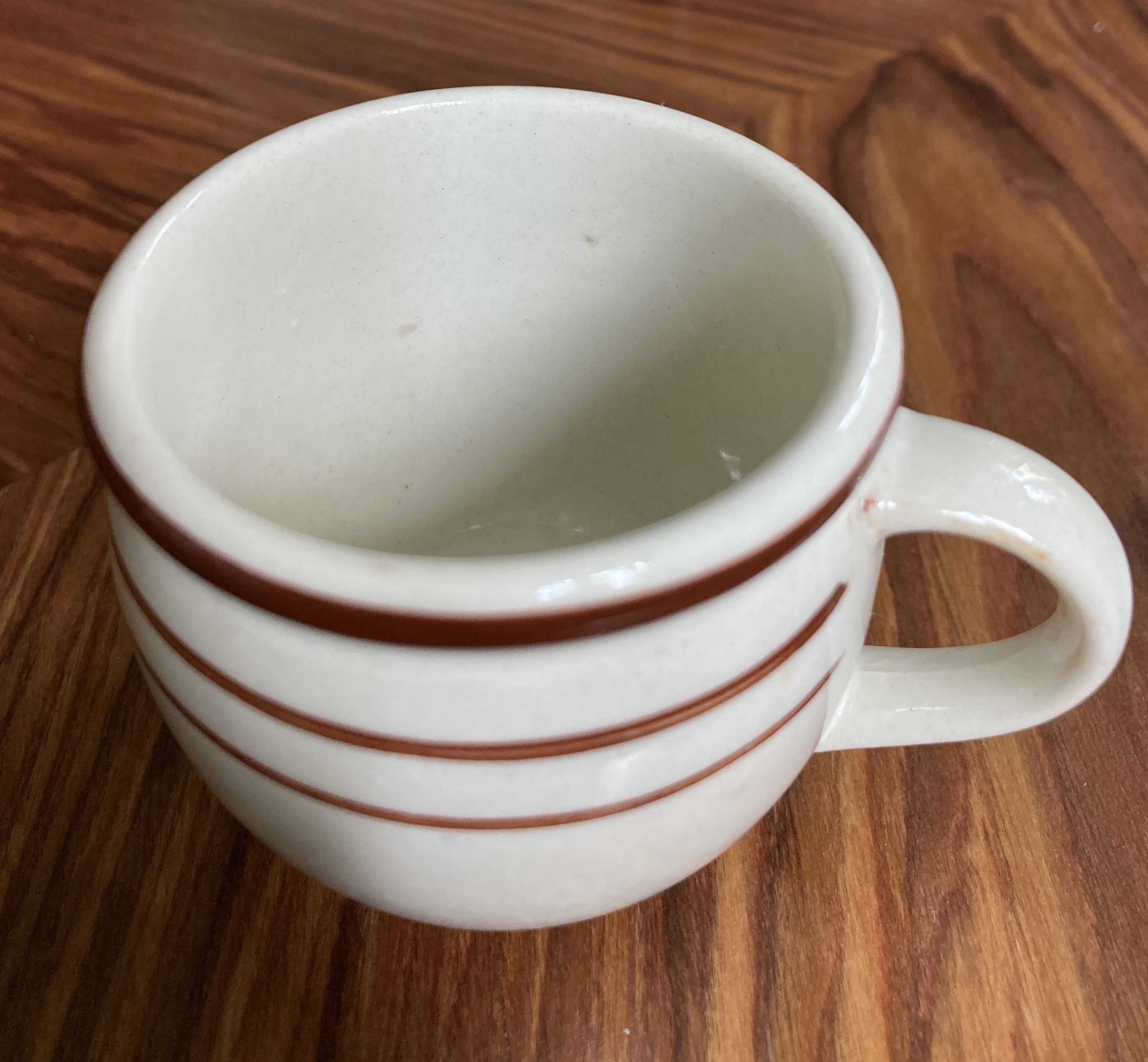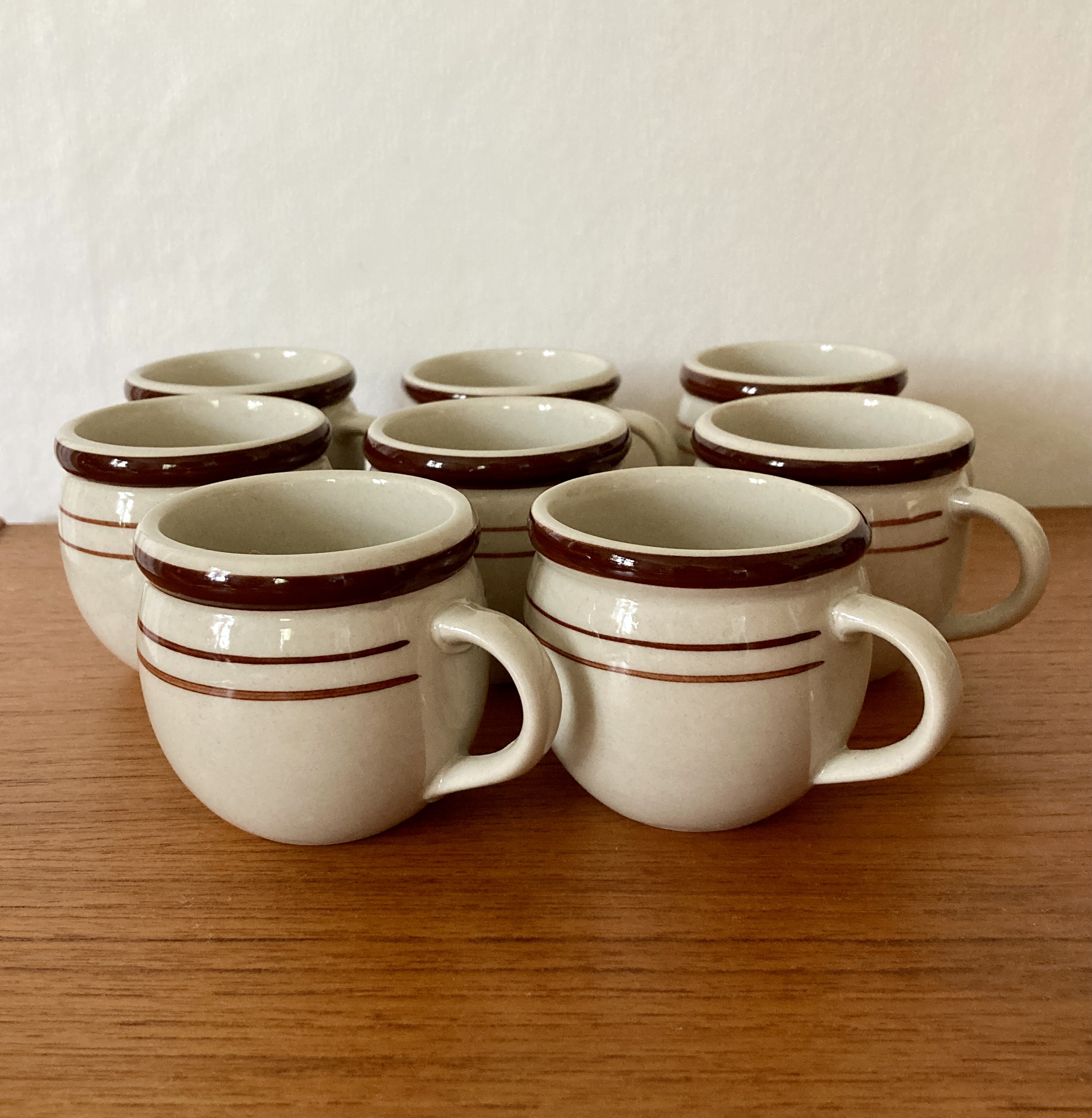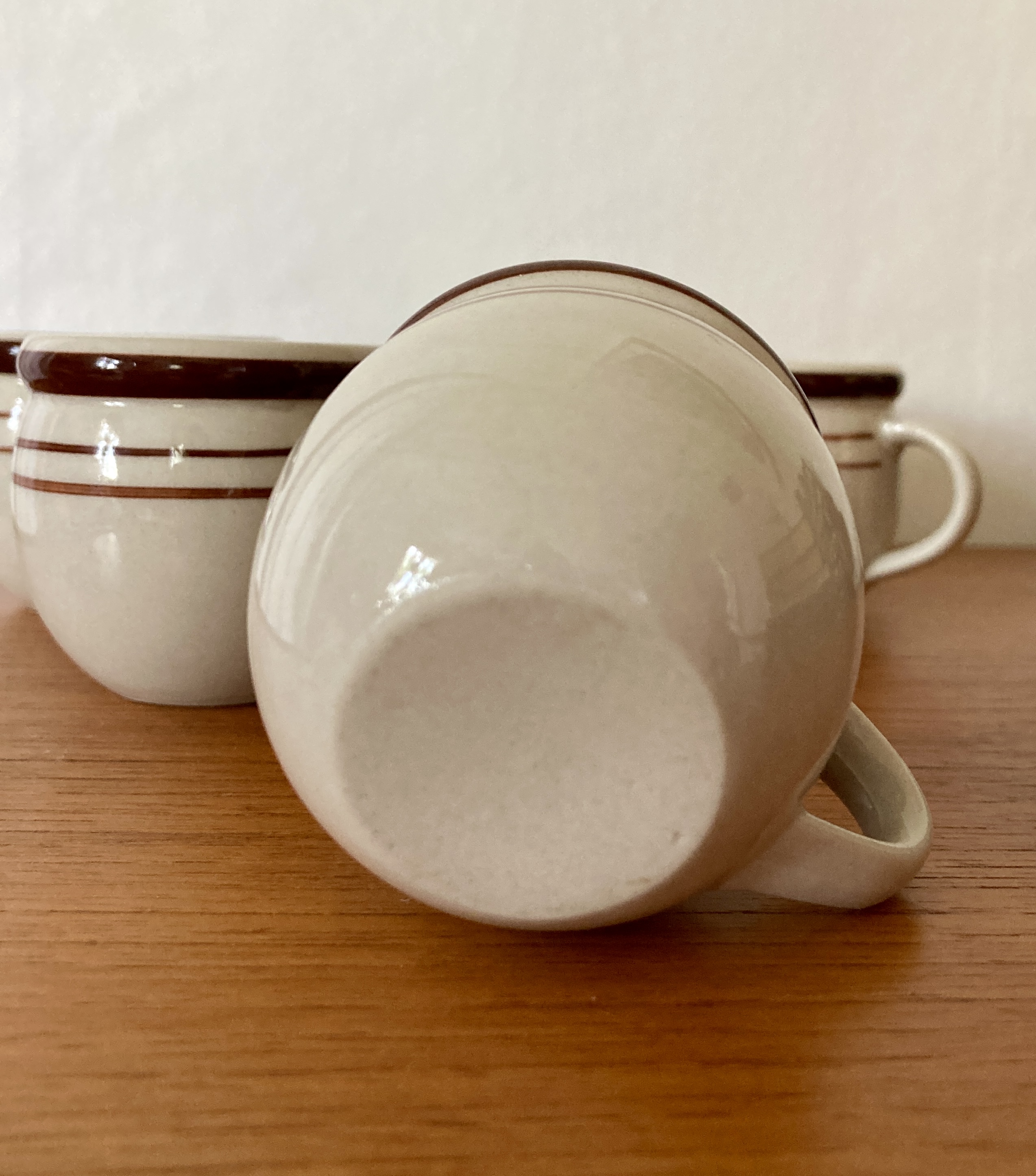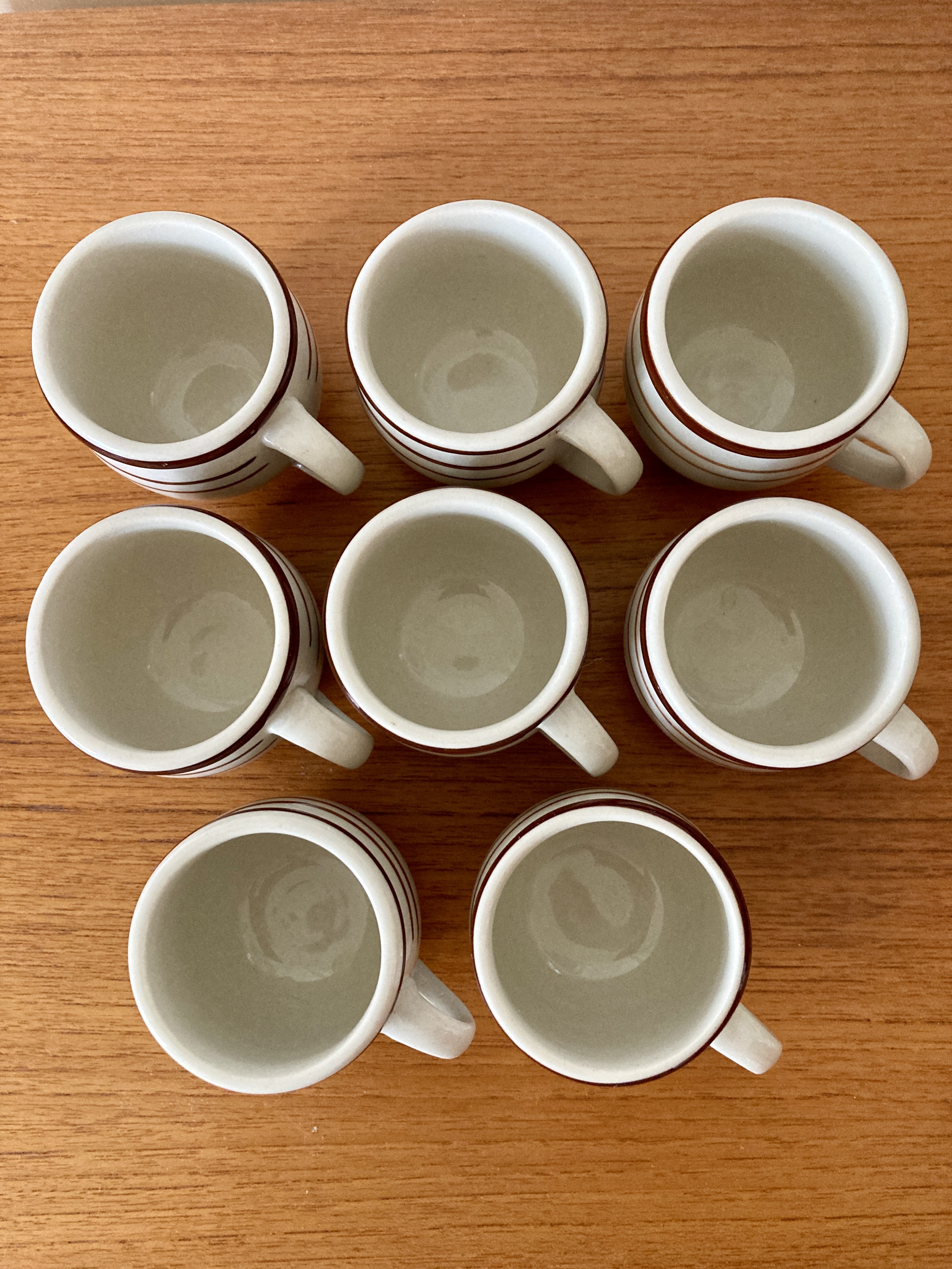These eight mugs in sand-coloured glazed ceramic porcelain with brown stripes could be of the Swedish brand Höganäs (Hoganas), but as there are no stamps anywhere, it’s just a guess based on their overall appearance. Probably from the 1970s.