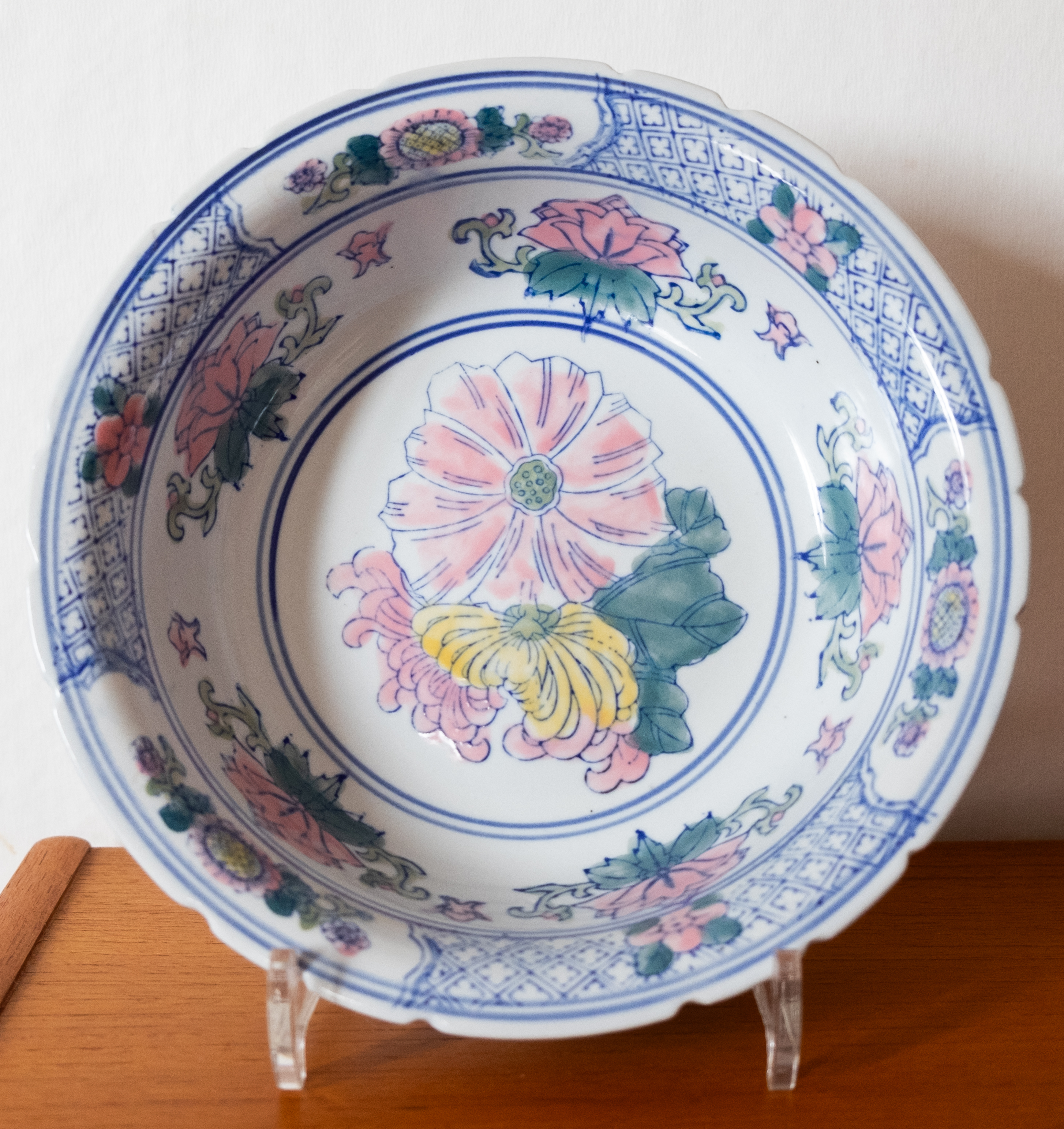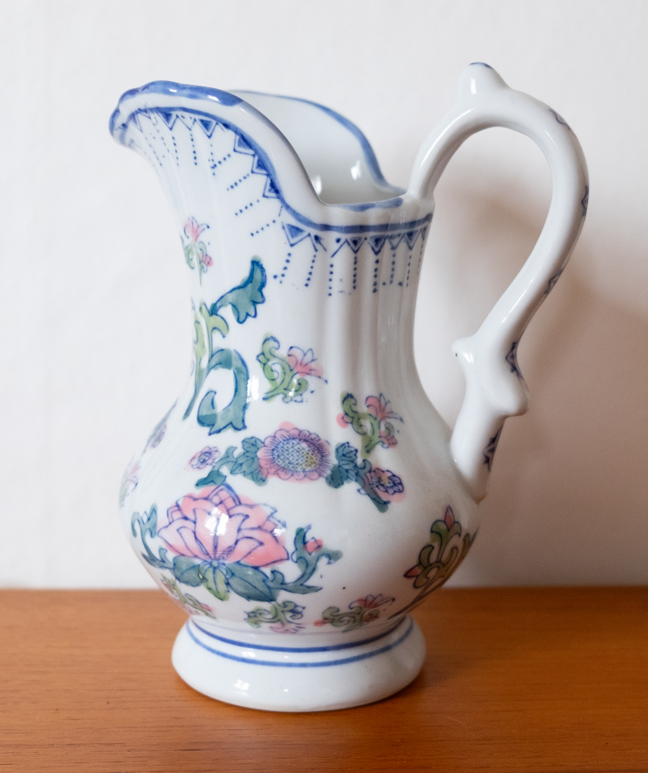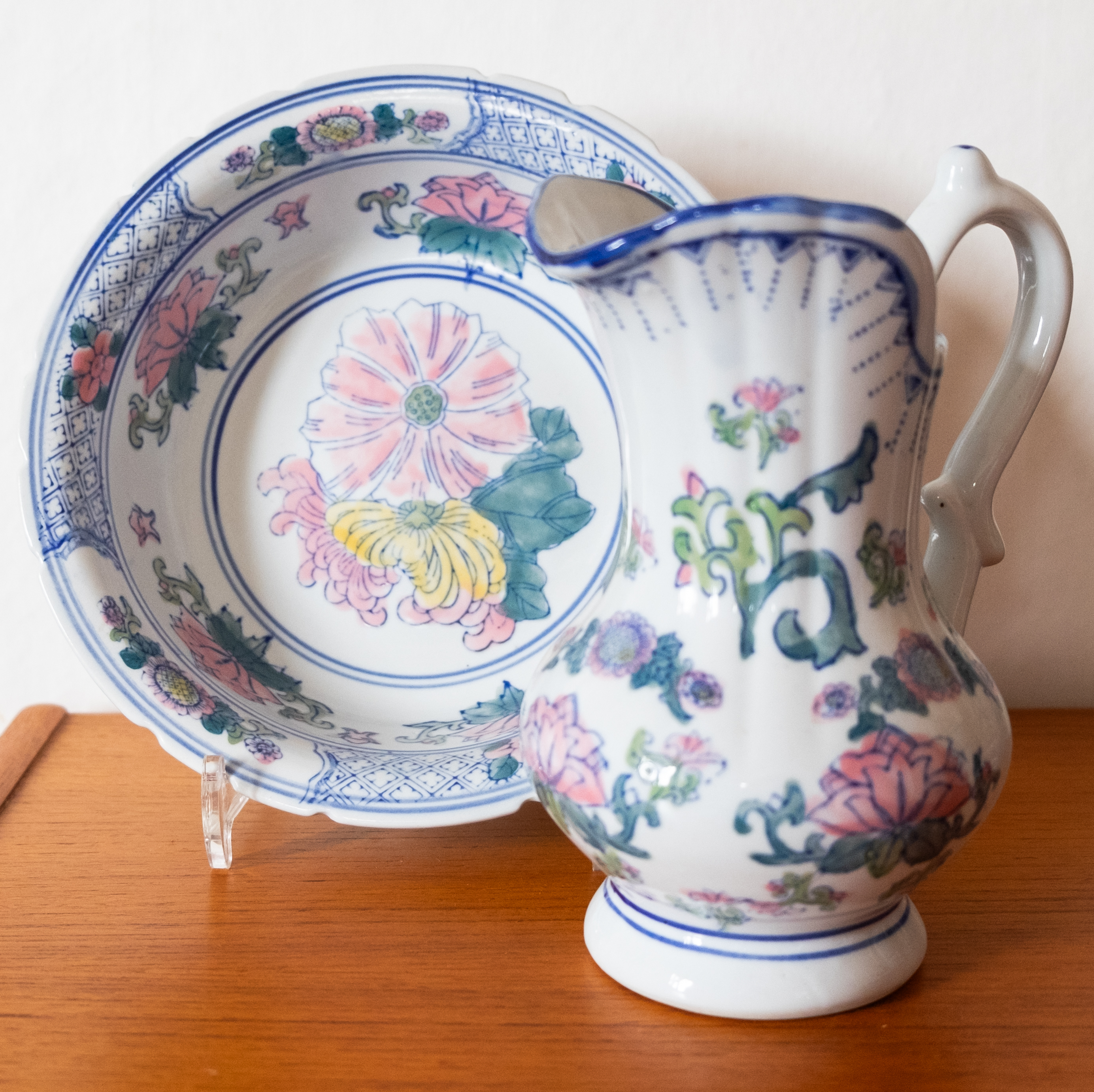 Vintage porcelain Jug and Plate / Bowl with flowery pattern in pink, blue, teal and yellow